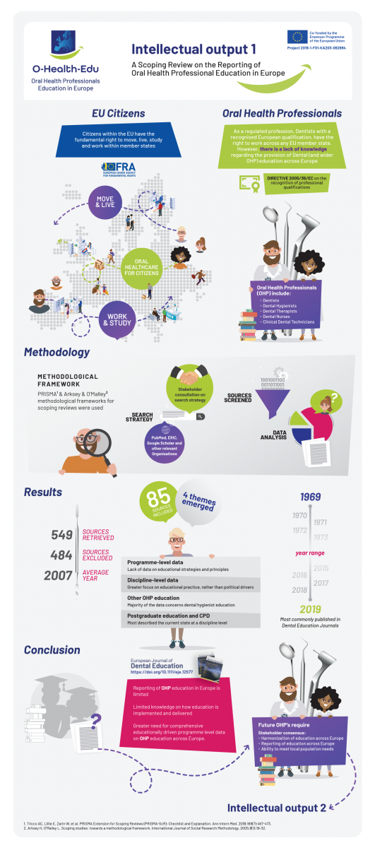 You can also download a summary infographic of the work of IO01 from the documents section below (IO01: A Scoping Review on the Reporting of Oral Health Professional Education in Europe infographics).