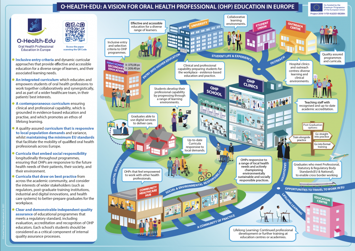 The vision aligns with the World Health Organisation milestones (2016) and resolutions (2021), and EU4Health programme (2020) objectives - and projects 20 years into the future, to 2040. The longitudinal vision takes a multi-stakeholder perspective to deliver OHP education that acts in the best interests of both students and patients, and sits within the context of a wider strategy for general health. Included in the paper, is the infographic below, to help communicate the vision to various stakeholders of OHP education.